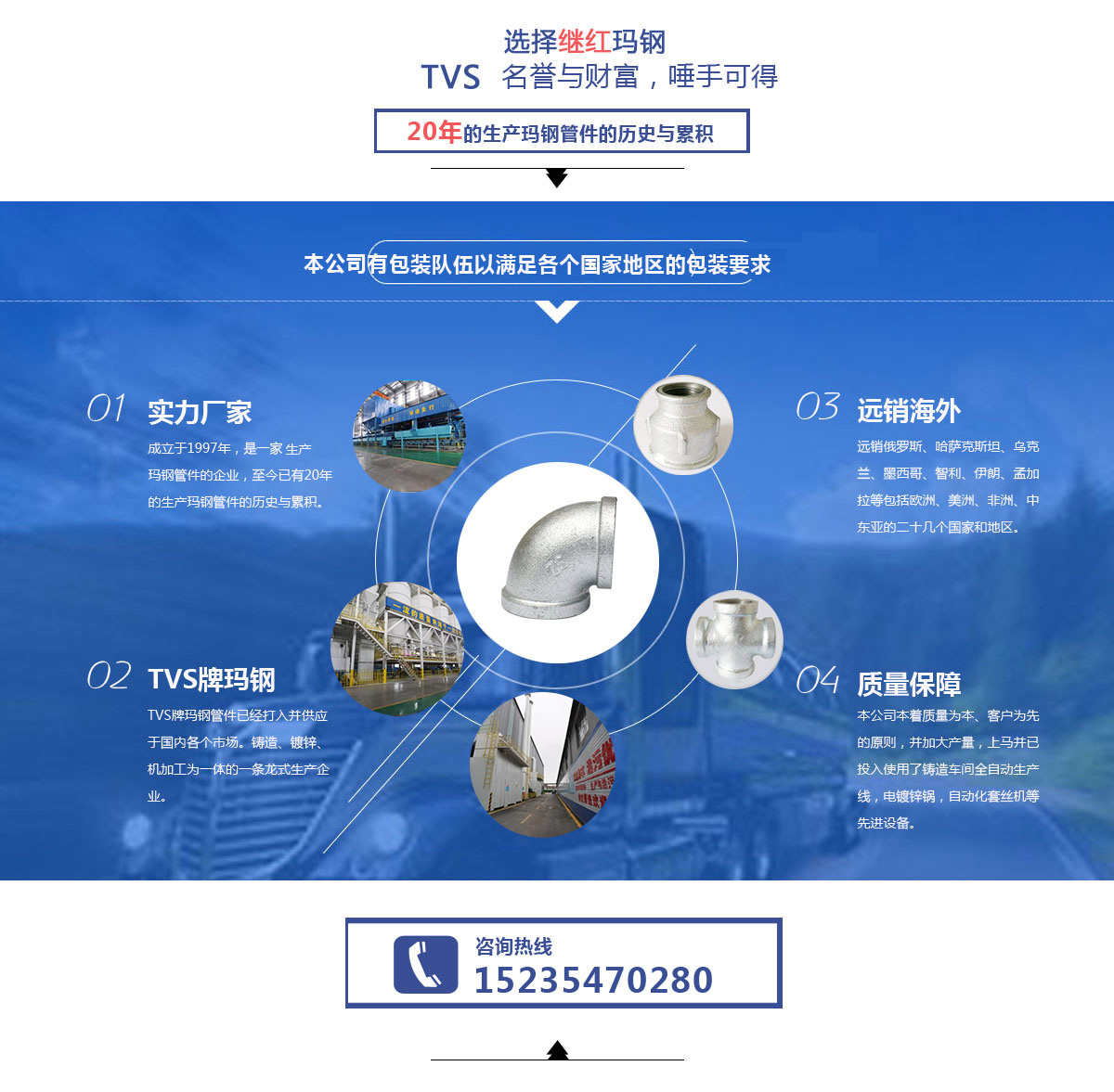 太谷繼紅瑪鋼鑄造有限責(zé)任公司座落于山西省太谷縣胡村瑪鋼工業(yè)園區(qū),成立于1997年,是一家專業(yè)生產(chǎn)瑪鋼管件的企業(yè),至今已有20年的生產(chǎn)瑪鋼管件的歷史與累積。其中,本公司在出口外貿(mào)瑪鋼管件方面尤其專業(yè)并具有相當(dāng)大的優(yōu)勢,長年生產(chǎn)的德標(biāo)管件、美標(biāo)管件、英標(biāo)管件遠(yuǎn)銷俄羅斯、哈薩克斯坦、烏克蘭、墨西哥、智利、伊朗、孟加拉等包括歐洲、美洲、非洲、中東亞的二十幾個(gè)國家和地區(qū)。